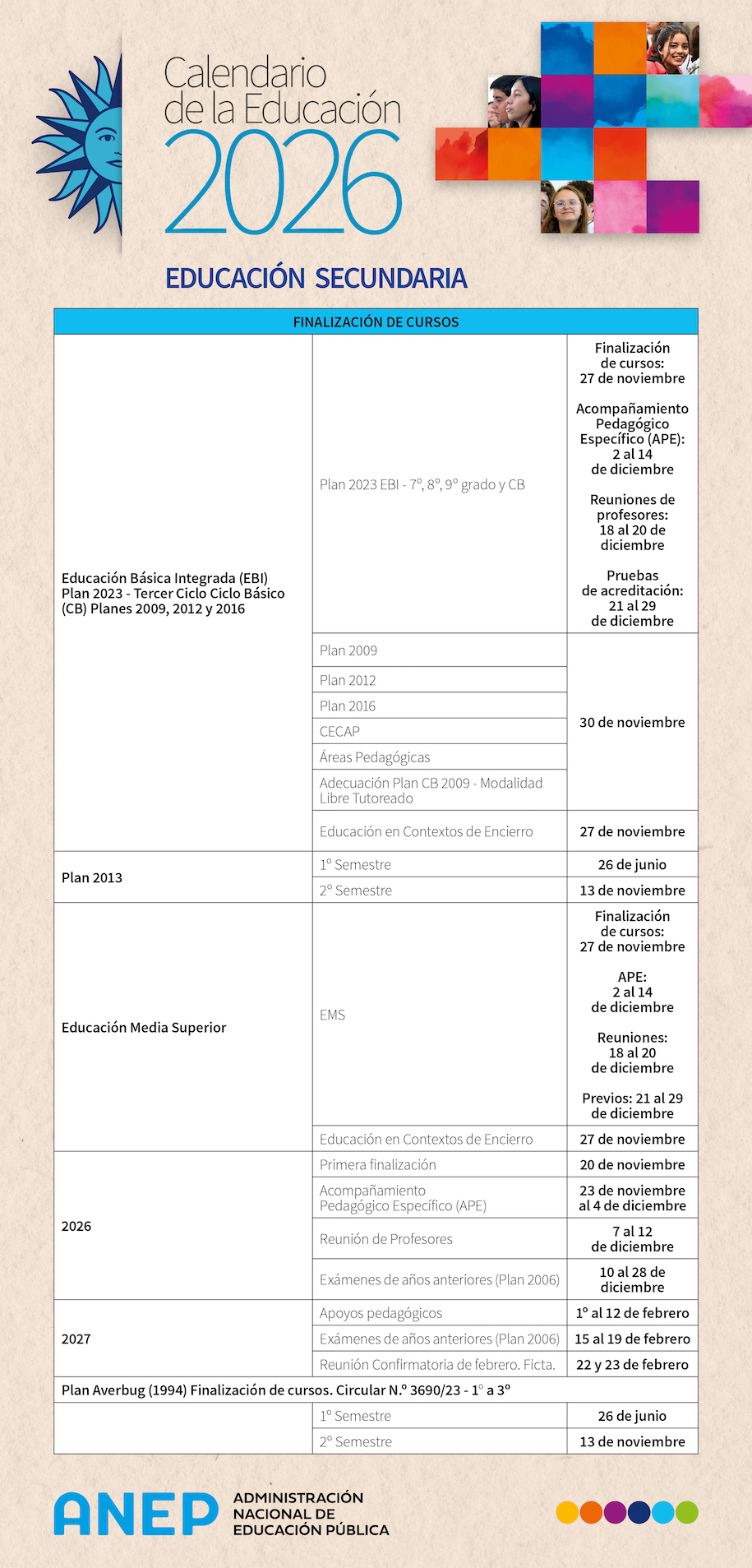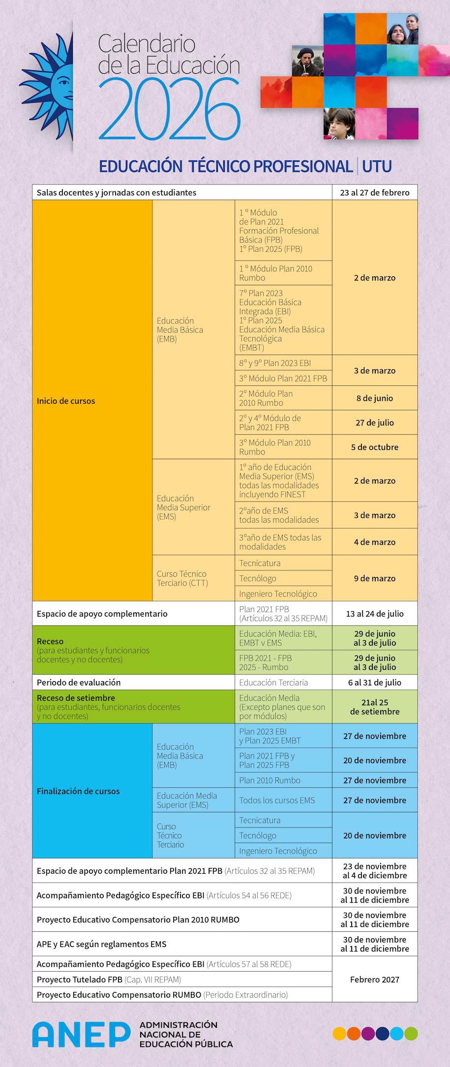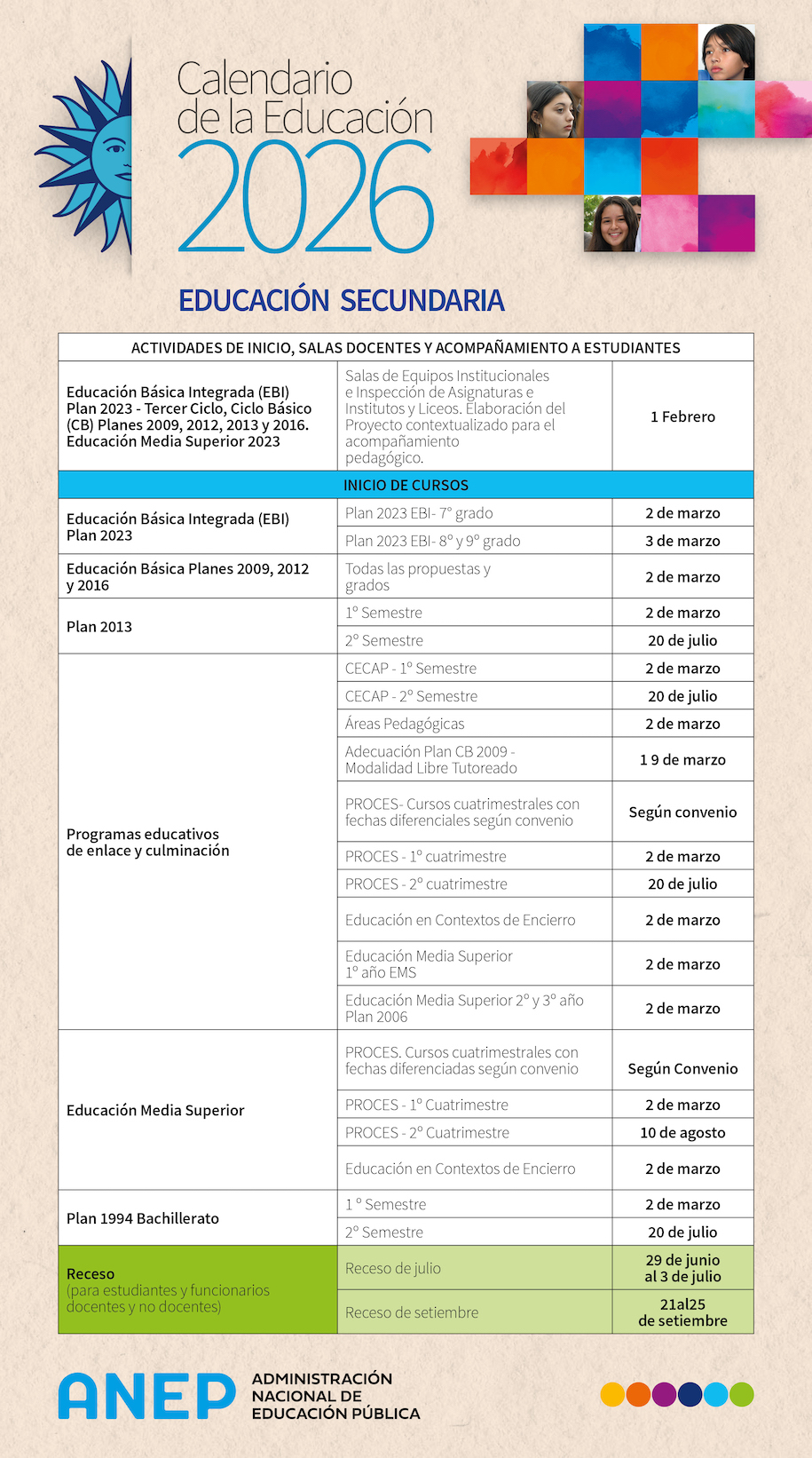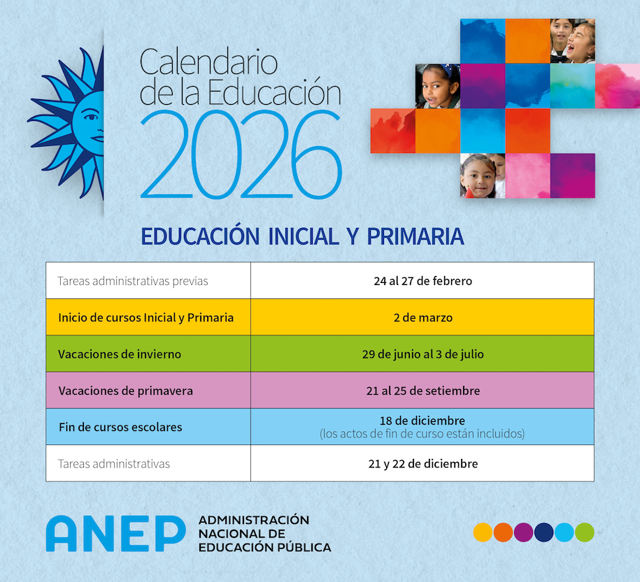 Calendario de actividades del año lectivo 2026 Publicado: 11/12/2025 El Consejo Directivo Central aprobó el calendario de actividades para el año lectivo 2026 de Educación Inicial y Primaria, Secundaria y Técnico Profesional. Resolución