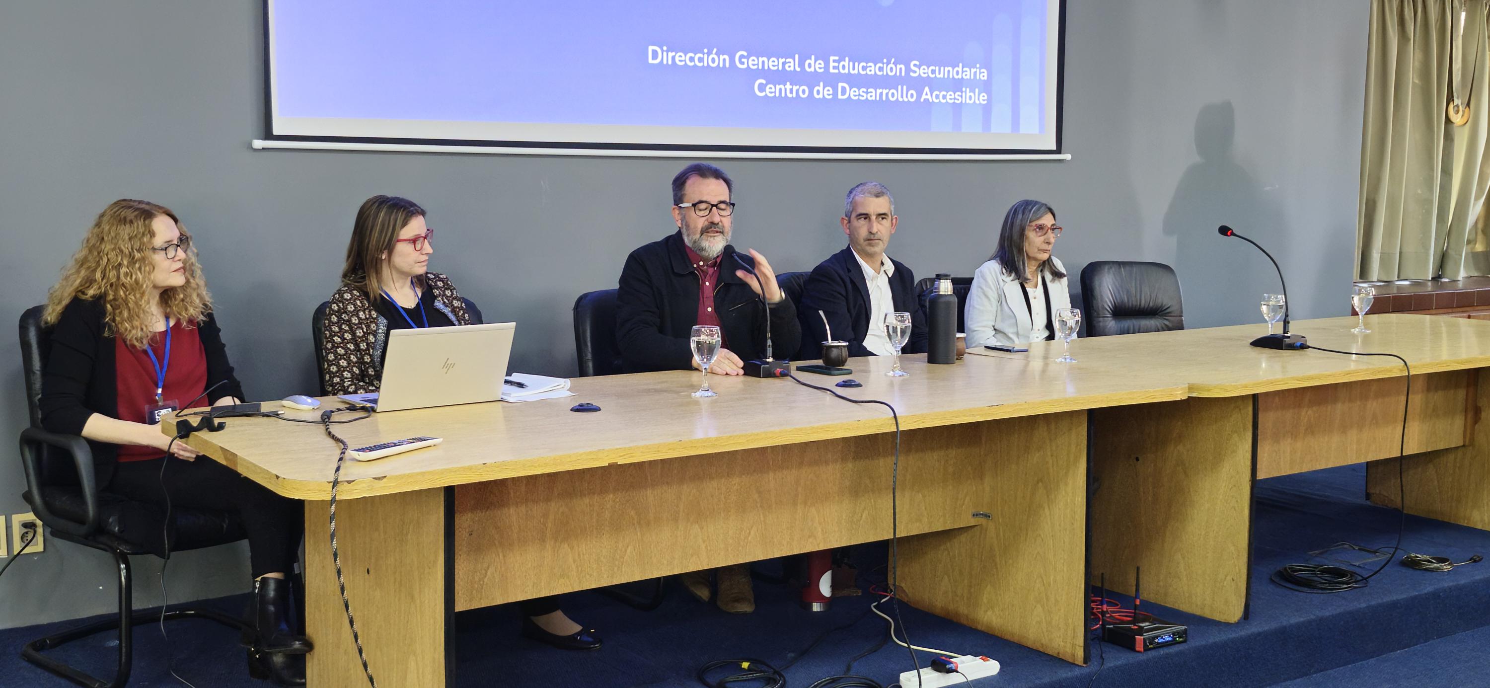 La apertura de la jornada, que se realizó en el Instituto de Perfeccionamiento y Estudios Superiores (IPEs), contó con la participación del presidente de la Administración Nacional de Educación Pública, Pablo Caggiani, del director general y subdirectora de Educación Secundaria, Manuel Oroño y Sandra Peña, respectivamente, y de María Eugenia Rodino y Viviana Linale, coordinadoras del Centro de Desarrollo Accesible.