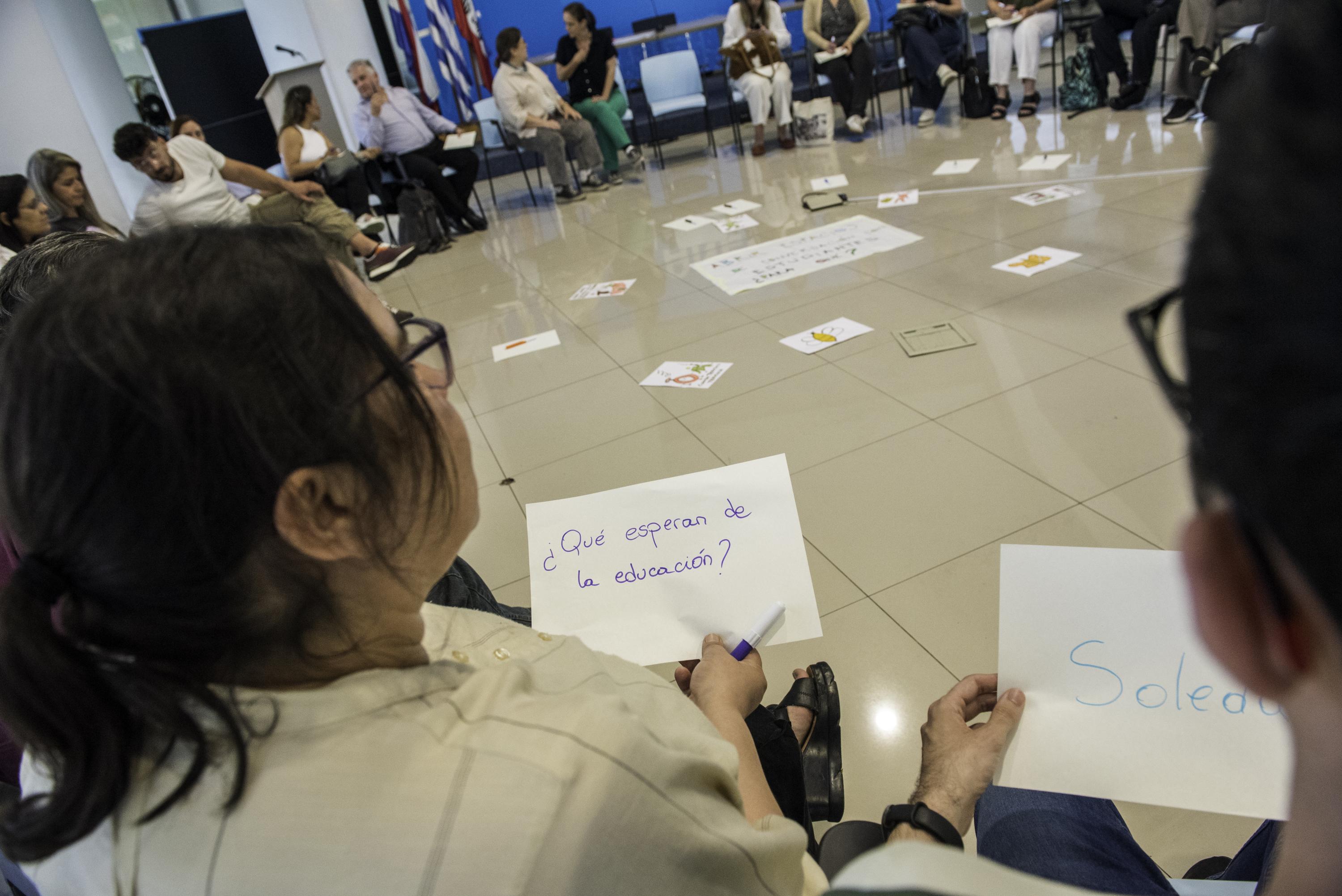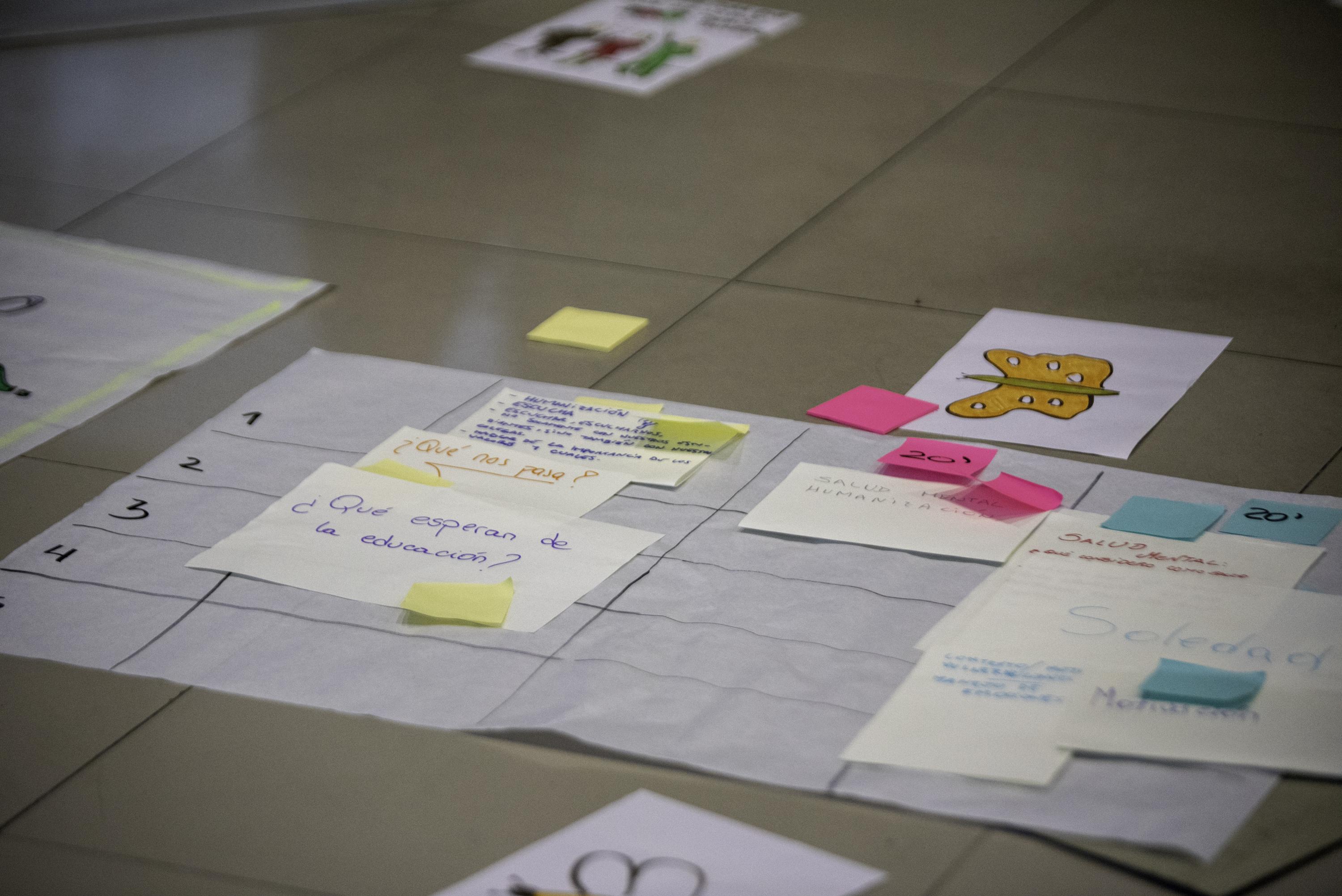 Ana Rubio, coordinadora de la actividad, desplegó papeles y marcadores en el piso, y propuso a los docentes escribir cuáles eran sus principales temas de preocupación o interés, con el objetivo de construir una agenda común. Luego de plasmar sus ideas por escrito, los profesores realizaron una puesta a punto.