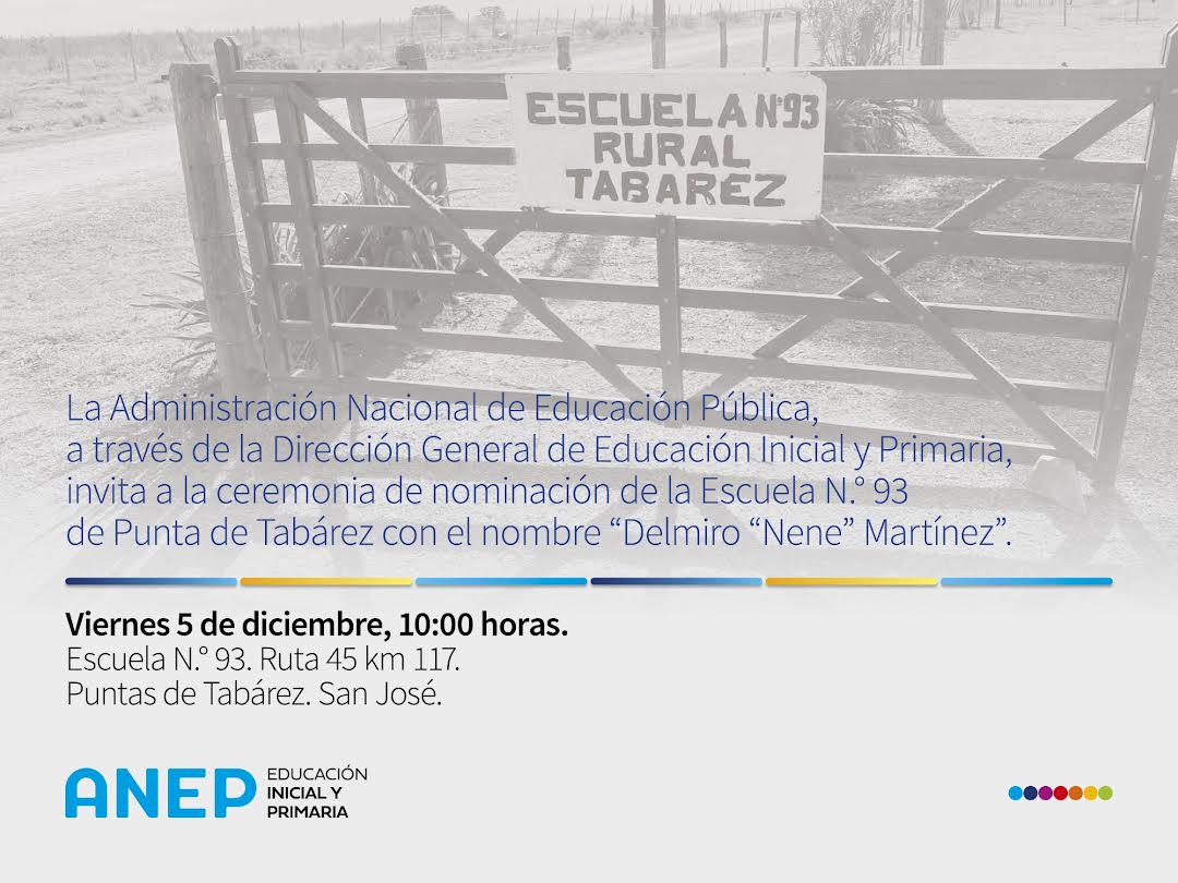 La Administración Nacional de Educación Pública, a través de la Dirección General de Educación Inicial y Primaria, invita a la Ceremonia de nominación de la Escuela N°93 de Punta de Tabárez con el nombre "Delmiro "Nene" Martínez".