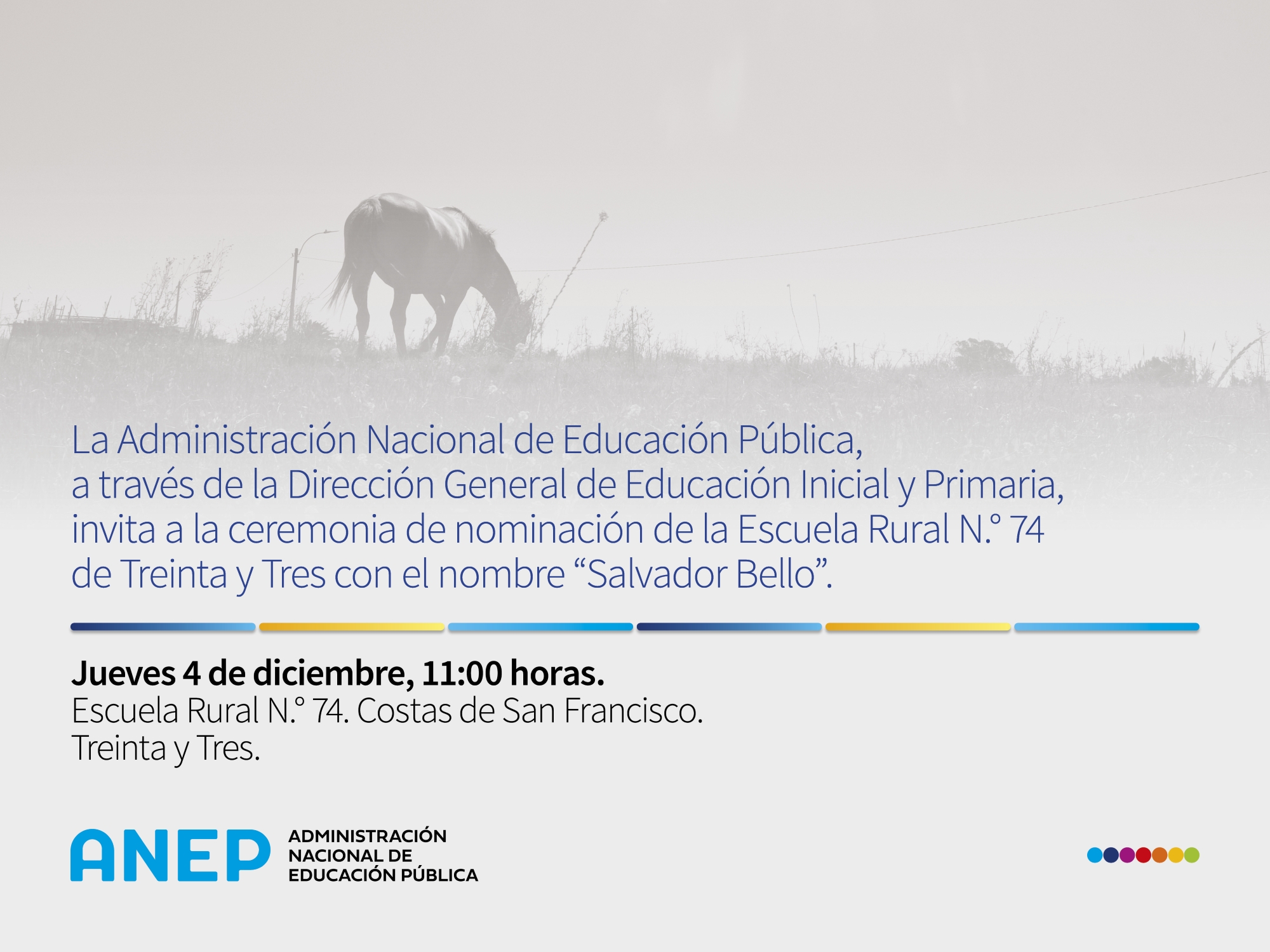 La Administración Nacional de Educación Pública, a través de la Dirección General de Educación Inicial y Primaria, invita a la ceremonia de nominación de la Escuela Rural N.°74 de Treinta y Tres con el nombre "Salvador Bello".