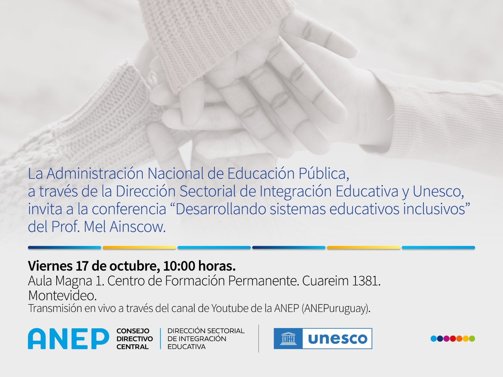 La Adminstración Nacional de Educación Pública, a través de la Dirección Sectorial de Integración Educativa y Unesco, invita a la conferencia "Desarrollando sistemas educativos inclusivos " del Prof. Mel Ainscow.