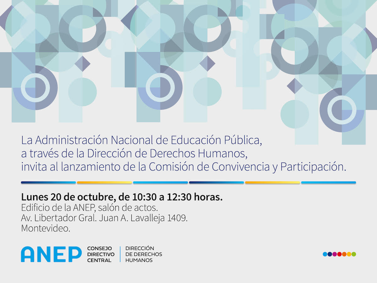 Evento suspendido | Lanzamiento de la Comisión de Convivencia y Participación Actividad: Evento suspendido. La nueva fecha se comunicará próximamente. Día: lunes 20 de octubre Hora: 10:30 a 12:30 horas Lugar: edificio de la ANEP, salón de actos, planta baja (Av. Libertador 1409)