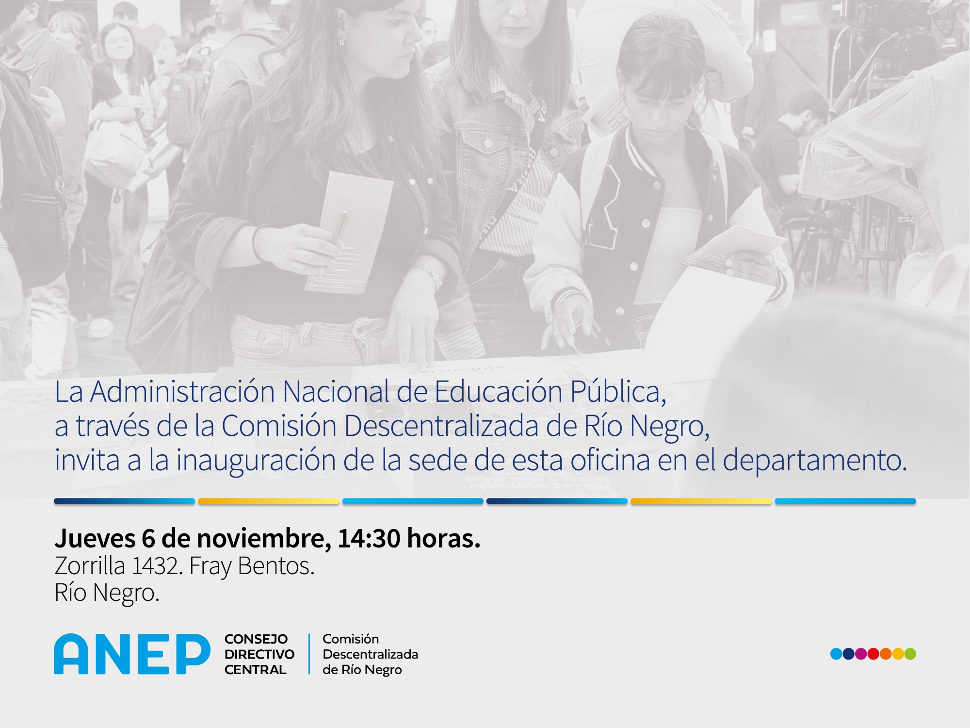 La Administración Nacional de Educación Pública, a través de la Comisión Descentralizada de Río Negro, invita a la inauguración de la sede de esta oficina en el departamento.