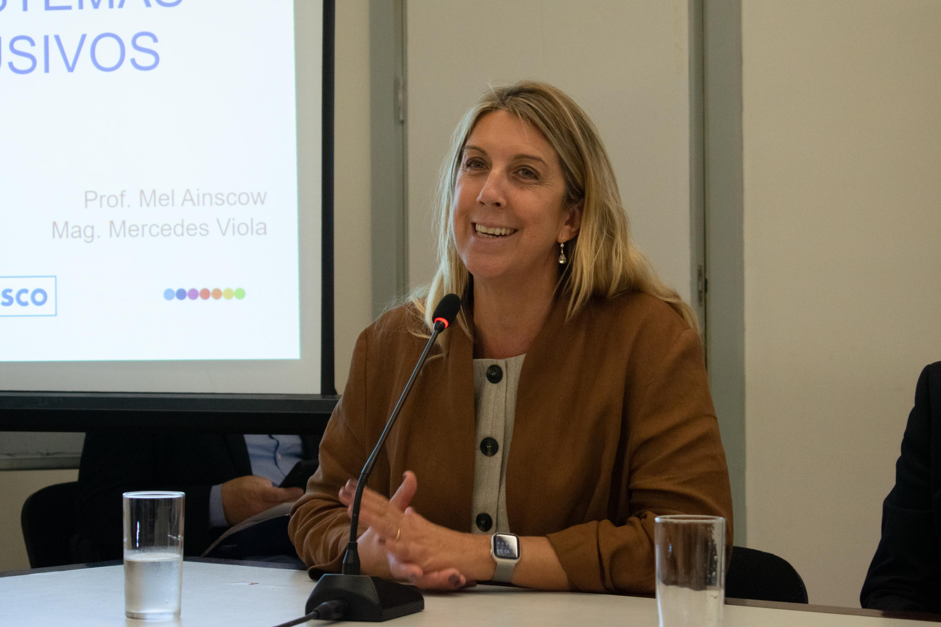 Ainscow inició su exposición expresando: “Quiero estimularlos a pensar en los retos del sistema educativo de Uruguay. Conozco muy poco de lo que ocurre aquí, así que no vengo a decirles qué es lo que tienen que hacer. Vengo a contarles qué está pasando en otras partes del mundo”.