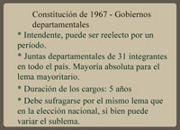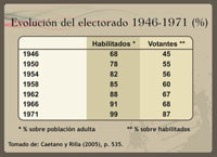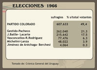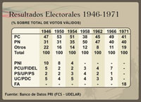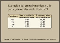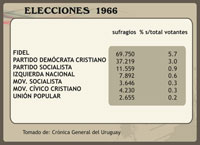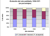 Los cuadros y gráficos precedentes fueron confeccionados sobre la base de los cuadros incluidos en Benjamín NAHUM; Ana FREGA; Mónica MARONNA; Yvette TROCHON, El fin del Uruguay liberal, 1959-1973 (Montevideo, Ediciones de la Banda Oriental, 1990), Gerardo CAETANO; José Pedro RILLA, Historia contemporánea del Uruguay. De la colonia al Mercosur (3ª ed. aumentada, Montevideo, CLAEH/Fin de Siglo, 2005), Washington REYES ABADIE; Tabaré MELOGNO, Crónica General del Uruguay. Vol. 4. El siglo XX (Montevideo, Ediciones de la Banda Oriental, 1995), Banco de Datos del Programa de Política y Relaciones Internacionales (PRI) de la Facultad de Ciencias Sociales de la UdelaR (acceso por http://www.fcs.edu.uy/pri/electorales.html) y Francisco VERNAZZA. “Sistema electoral uruguayo y descenso de la representatividad de los diputados (1925-1984)”. Ponencia presentada al seminario Los partidos políticos uruguayos,un itinerario de aprendizajes y bloqueos”; CLAEH; Montevideo, 29 y 30 de octubre de 1987, mimeo.