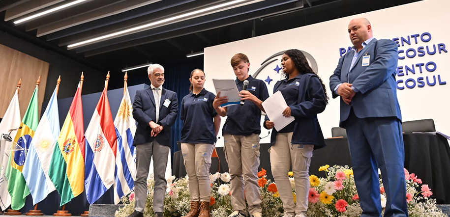 Parlamentarios juveniles entregaron su declaración oficial al presidente del Parlasur Humberto Costa (Brasil) y al vicepresidente Nicolás Viera (Uruguay), reforzando el diálogo, la participación y el compromiso de las juventudes con la integración regional. La ceremonia se realizó durante su CIV Sesión Ordinaria y II Sesión Extraordinaria del Parlasur.