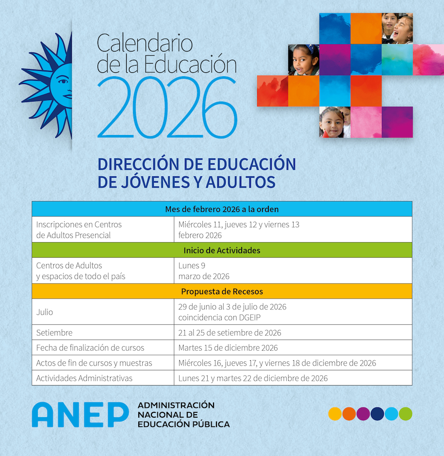 La Dirección de Educación de Jóvenes y Adultos de la Administración Nacional de Educación Pública (ANEP) informa que el inicio de cursos en centros y espacios de todo el país dependientes de esta Dirección será el próximo lunes 9 de marzo de 2026.