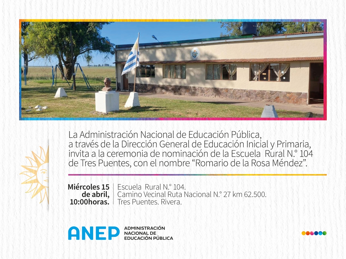 Nominación de la Escuela N.° 104 de Tres Puentes Actividad: La Administración Nacional de Educación Publica, a través de la Dirección General de Educación Inicial y Primaria, invita a la ceremonia de nominación de la Escuela Rural N.° 104 de Tres Puentes, con el nombre "Romario de la Rosa Méndez". Día: 15 de abril Hora: 10:00 horas Lugar: Rivera