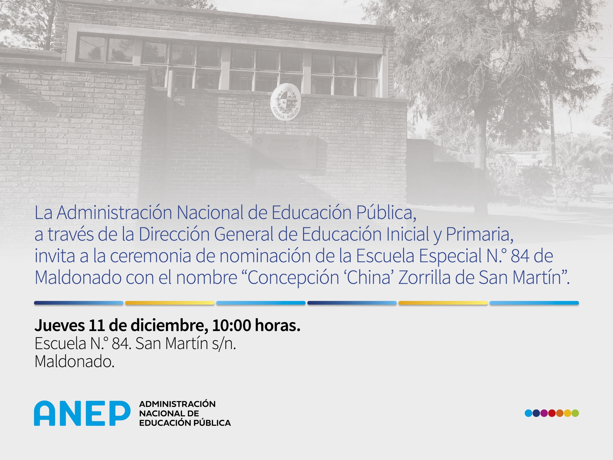 La Administración Nacional de Educación Pública, a través de la Dirección General de Educación Inicial y Primaria, invita a la ceremonia de nominación de la escuela Especial N.° 84 de Maldonado con el nombre "Concepción 'China' Zorrilla de San Martín".