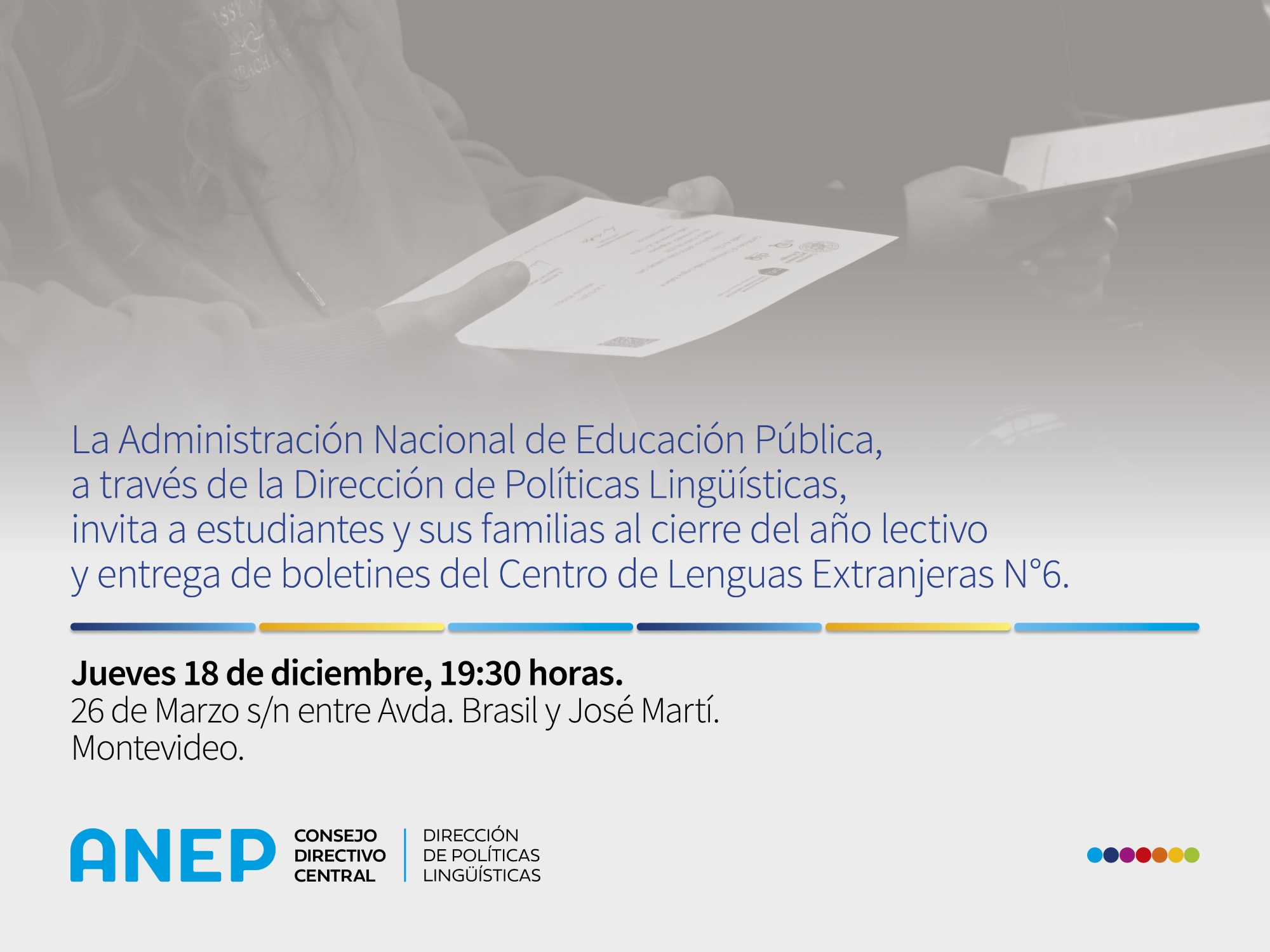 La Administración Nacional de Educación Pública, a través de la Dirección de Políticas Lingüísticas, invita a estudiantes y sus familias al cierre del año lectivo y entrega de boletines del Centro de Lenguas Extranjeras N.°6.