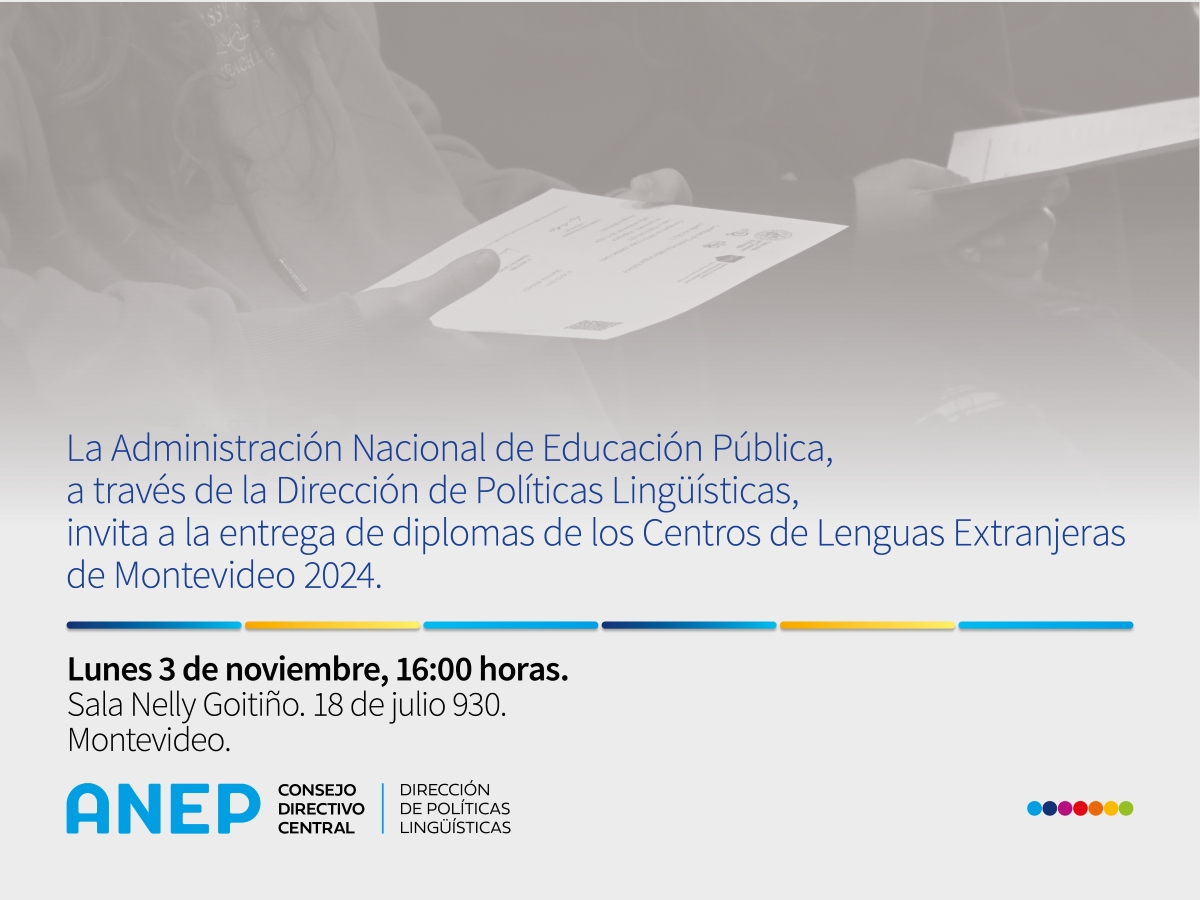 La Administración Nacional de Educación Pública, a través de la Dirección de Políticas Lingüísticas , invita a la entrega de diplomas de los Centros de Lenguas Extranjeras de Montevideo 2024.