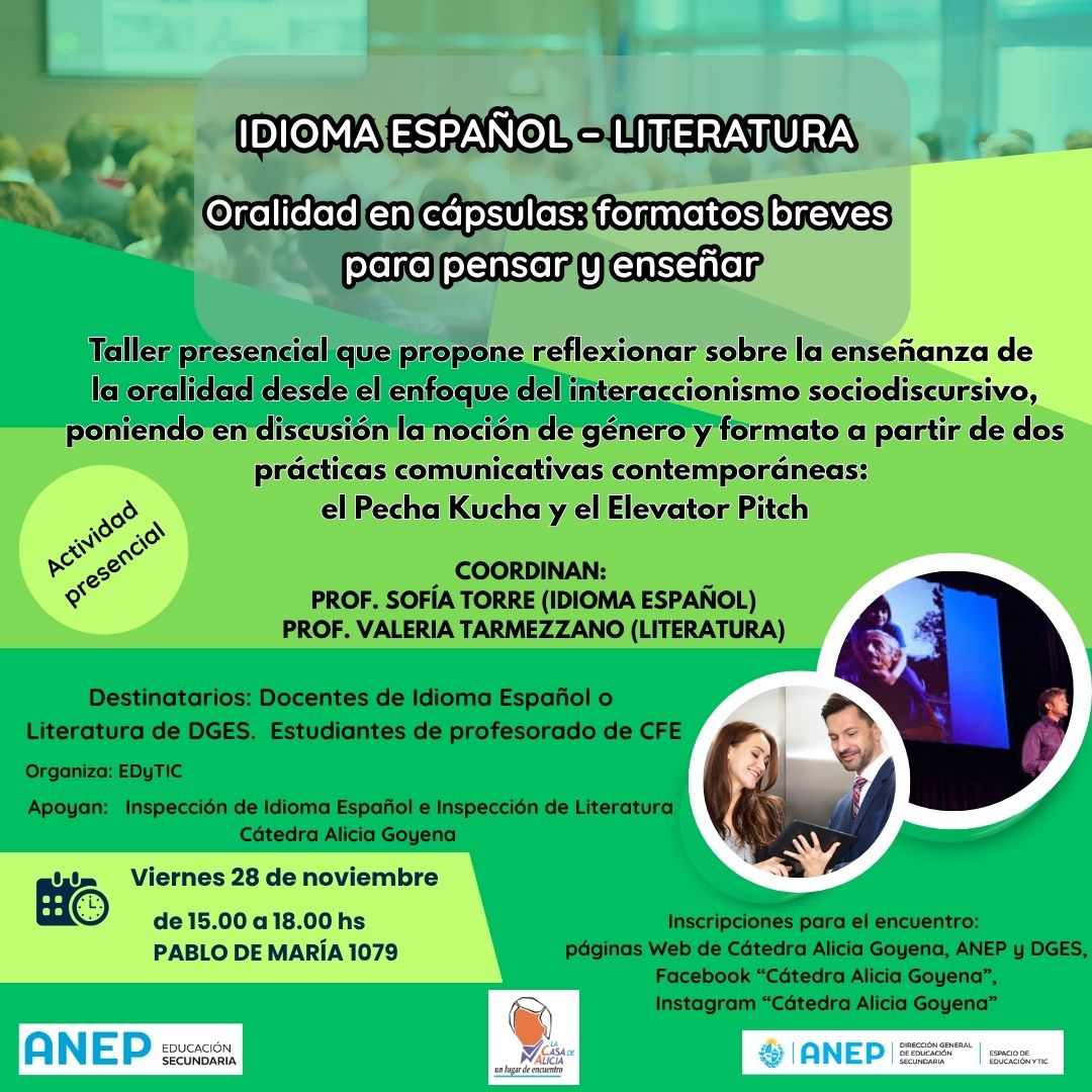 La Casa de Alicia invita a participar del taller organizado por EDyTIC "Oralidad en cápsulas: formatos breves para pensar y enseñar". Destinado a Docentes de Idioma Español o Literatura de Educación Secundaria. Estudiantes de profesorado de ambas asignaturas de CFE.